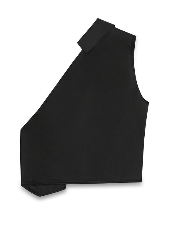 Asymmetrical detail, one-shoulder vest bag with front zip closure.