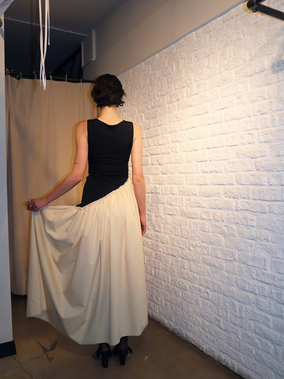 The top part is a black sleeveless, fitted dress, and the bottom part is a beige poplin dress with a raw finish and fastening.