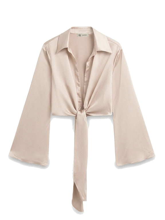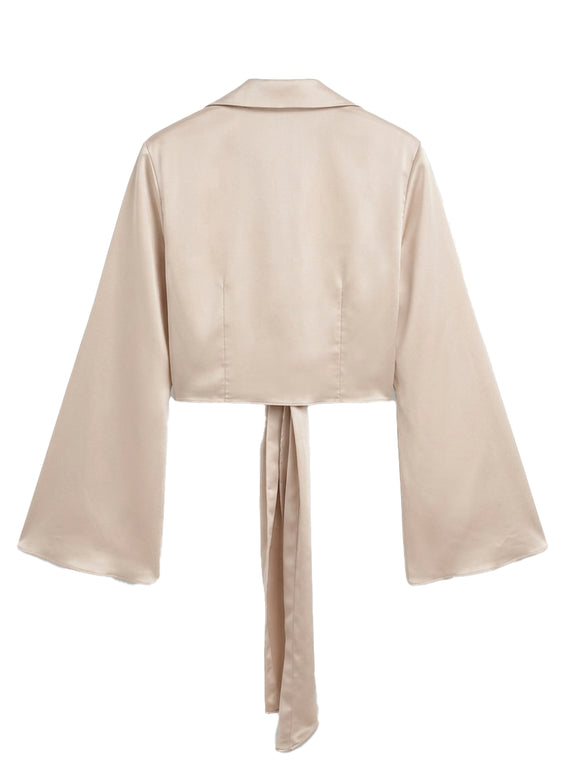 An elegant blouse with a satin texture, flare sleeve details, and tie-up closure.