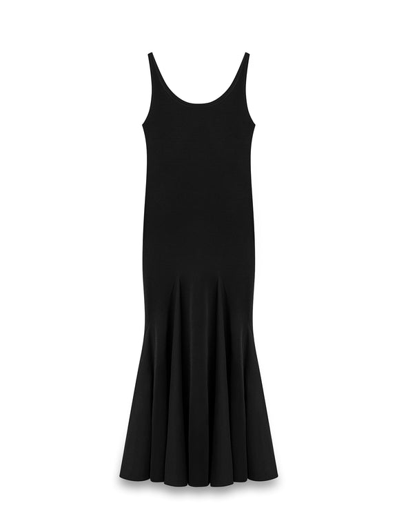 Askılı, etek ucu üçgen vual parçalı uzun elbise.